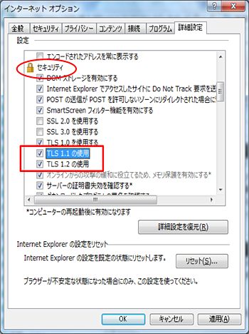 <Internet Explorer での TLS 1.1 および TLS 1.2 の有効化>